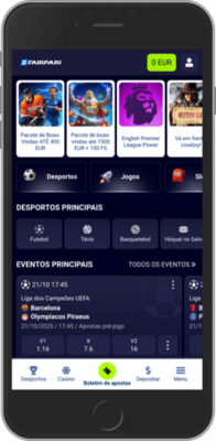 A FairPari oferece uma experiência de navegação simples e eficiente, adaptada tanto a iniciantes como a utilizadores experientes. A estrutura da plataforma facilita o acesso rápido aos mercados desportivos e às promoções, com apostas colocadas em apenas alguns passos. O design moderno e minimalista, aliado a menus intuitivos, contribui para uma utilização fluida desde o registo até à realização das apostas.